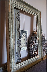 En prachtig schild van een Madonna vond ik een aantal weken terug bij Laif & Nuver in Groningen. Er waren verschillende soorten maar deze Madonna sprong er voor mij gelijk uit. Ik werd gelijk geinspireerd om deze in mijn oude lijst te hangen. De kleuren van deze Madonna passen zo mooi bij de kleuren van de afgebladerde lijst….ja, helemaal leuk!