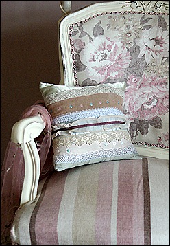 In deze stof vind ik het zonde om de lijsten tegen het paneel te schroeven, zoals bij het vorige paneel wel het geval was. Ik heb twee lege lijsten gebruikt en dit met lint boven op de kast vast gemaakt met een punaise. In één lijst heb ik een zijden pen met een hartenspeld in het fiber vast gezet en in de ander lijst heb ik een broche in het fiber geprikt.
