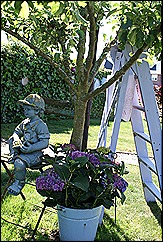 Onder de appelboom staat niet alleen de trap, ook Charlie mag graag op het bistrostoeltje onder de boom zitten, lezend in een boek en genieten van de hortensia.