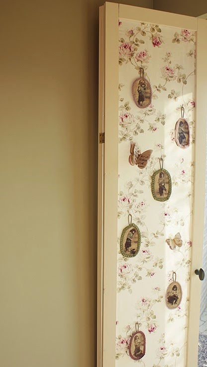 Op één paneel heb ik een paar kaarten en vlinders gestoken met een parel speld. Wel door de rozenstof maar niet door de voering geprikt, zo zie je de spelden niet aan de achterkant. De achterkant heb ik niet op de foto maar dat is gewoon uni effen crème stof.