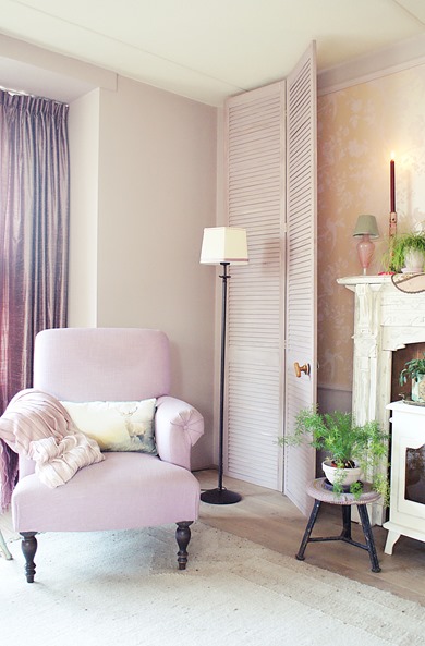 De lila stoel hebben wij al een aantal jaren en is favoriet bij onze poes Molly. Ook de lamp erachter staat er al sinds wij hier wonen (februari 2016 11 jaar). Heb de kap mij destijds eigen gemaakt door onder roze satijn lint en boven een dun rozenbandje te doen.